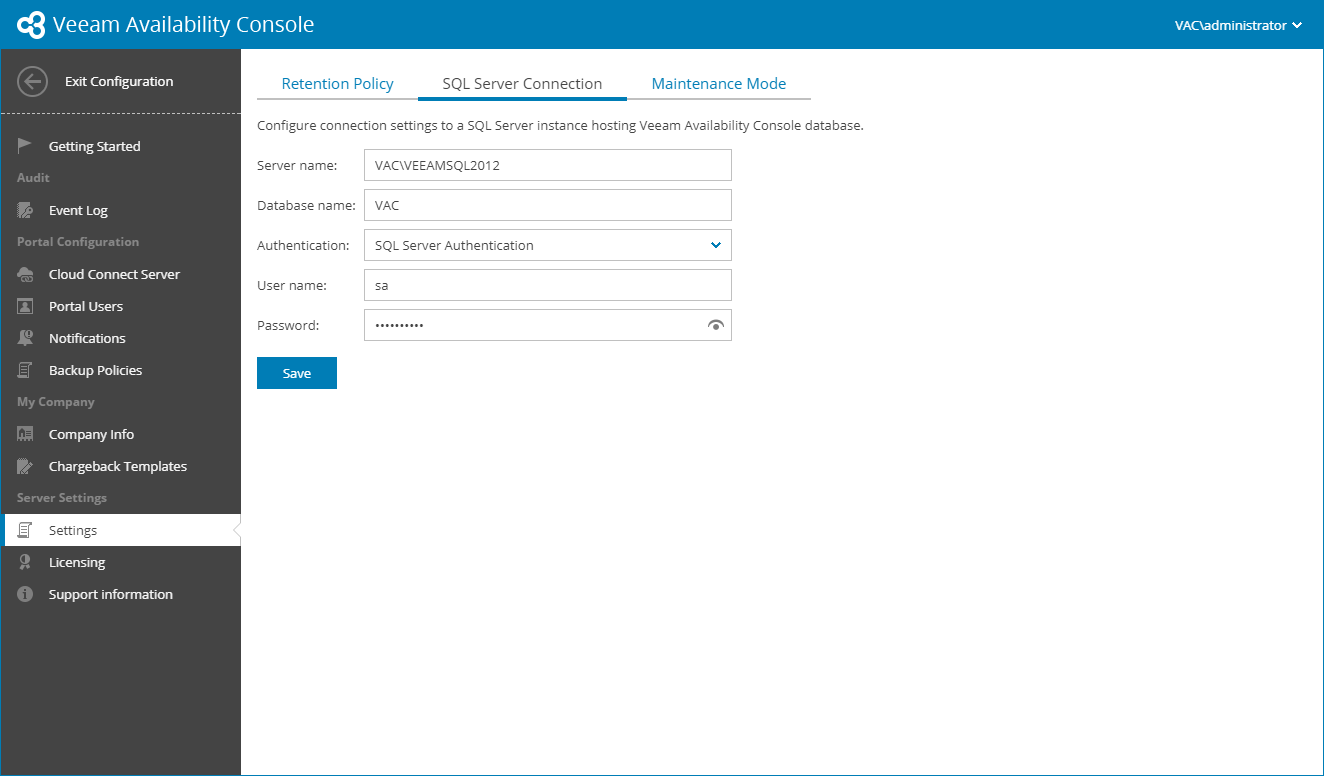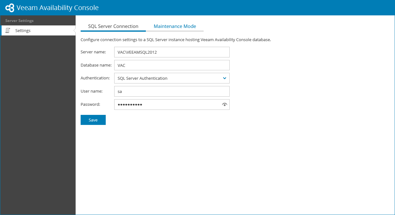 By default, Veeam Availability Console connects to the Microsoft SQL Server using credentials specified in the Veeam Availability Console Setup wizard.