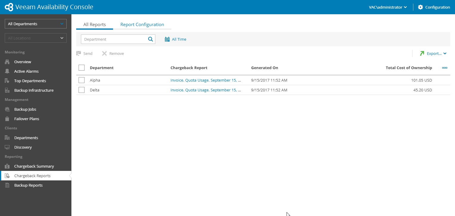 - Department/Location — limit the list of chargeback reports by department and location for which chargeback reports were generated. To limit the list of chargeback reports by department and location, use filters at the top left corner of the Veeam Availability Console window.