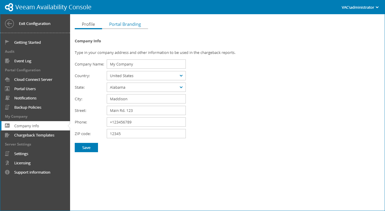 Before you start working with Veeam Availability Console, you must fill in the company profile. The profile contains information about your company, such as the company name, address and so on. Company profile details are displayed in chargeback reports, backup reports and email notifications.