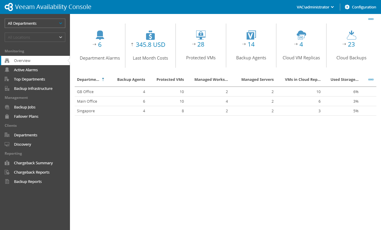 - To show data for a specific department and/or location, use department and location filters at the top left corner of the Veeam Availability Console window.
