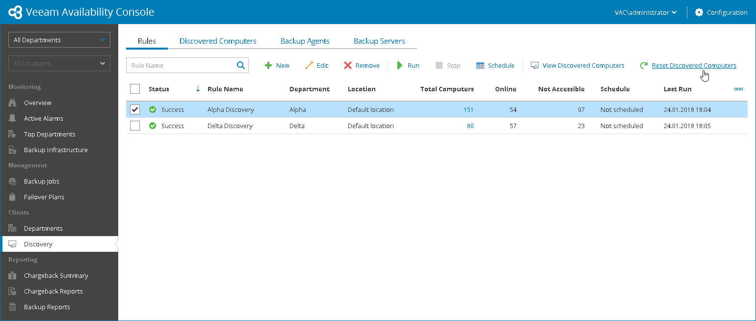 When you perform reset for a discovery rule, computers discovered with this rule are removed from the discovered computers list. However, computers on which Veeam Availability Console management agents are already installed remain in the list even after you perform reset.