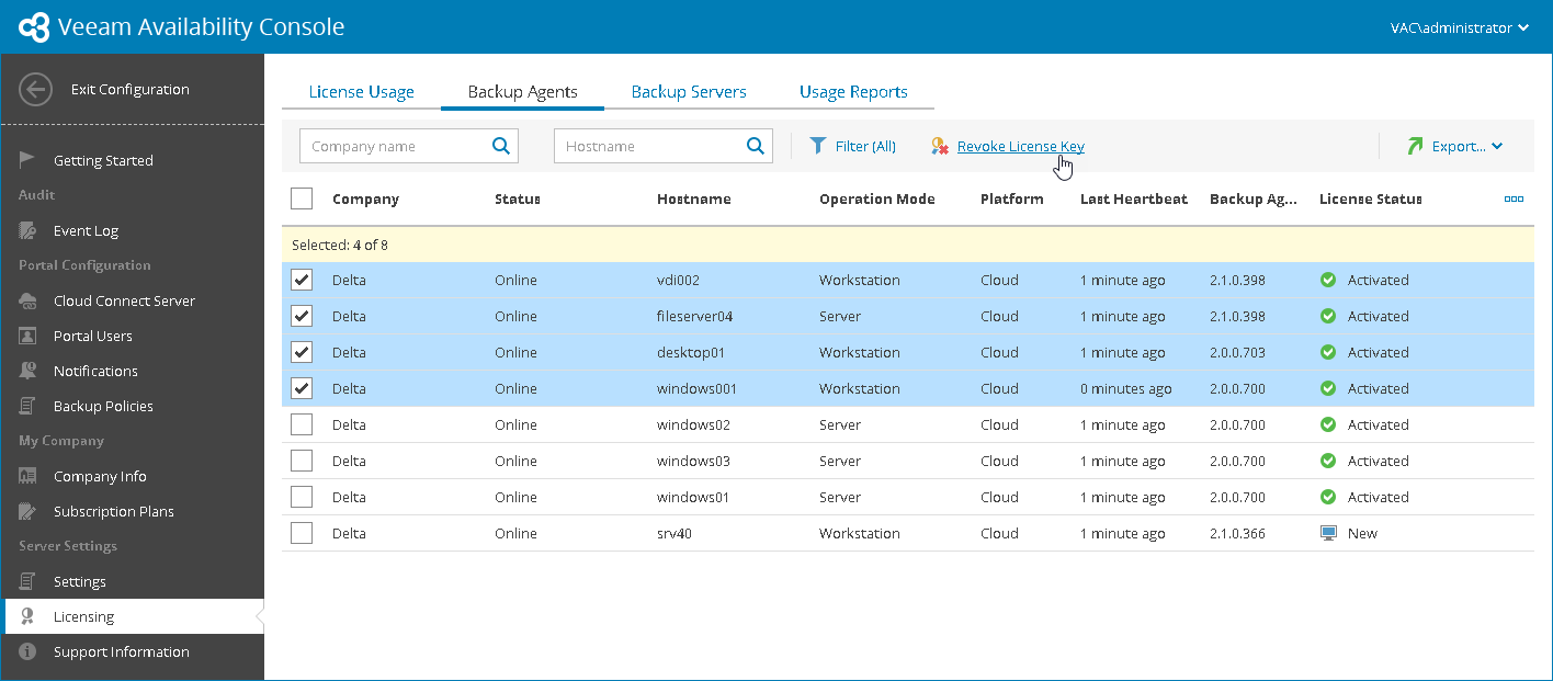You can also manually revoke licenses from one or more Veeam backup agents. When licenses are revoked, a Veeam Availability Console management agent is removed from a managed computer, and Veeam backup agent is switched to the Unmanaged mode (Free mode).