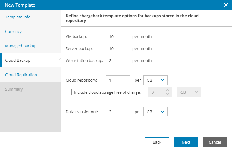 1. In the VM backup field, specify a charge rate for storing one VM in backup on a cloud repository, per month.