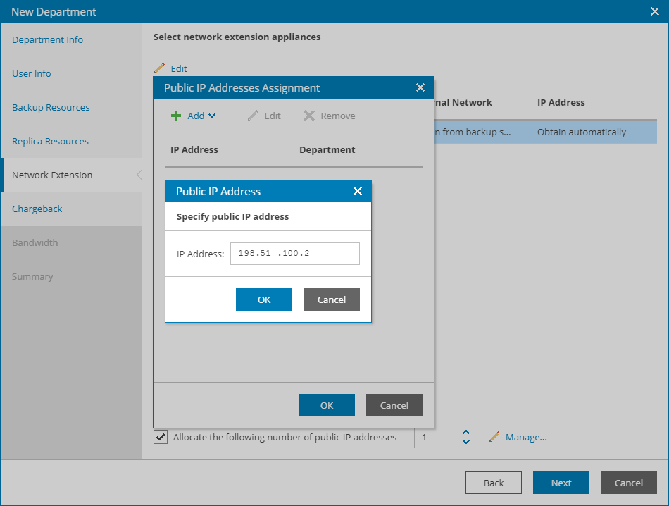 Veeam Backup & Replication will assign to the department the specified number of IP addresses from the reserved pool. A backup administrator on the department side can map a public IP address to a VM replica during cloud failover plan configuration. To learn more, see Specify Public IP Addressing Rules.