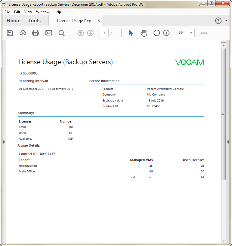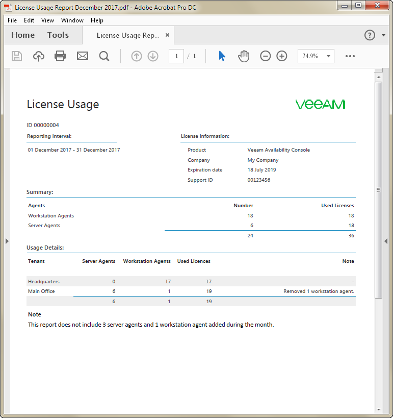 An example of a Veeam Backup & Replication license usage report is provided below.
