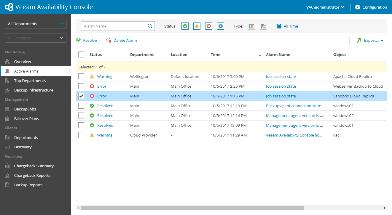 - Department/Location — limit the list of alarms by department and location for which alarms were triggered. To limit the list of alarms by department and location, use filters at the top left corner of the Veeam Availability Console window.