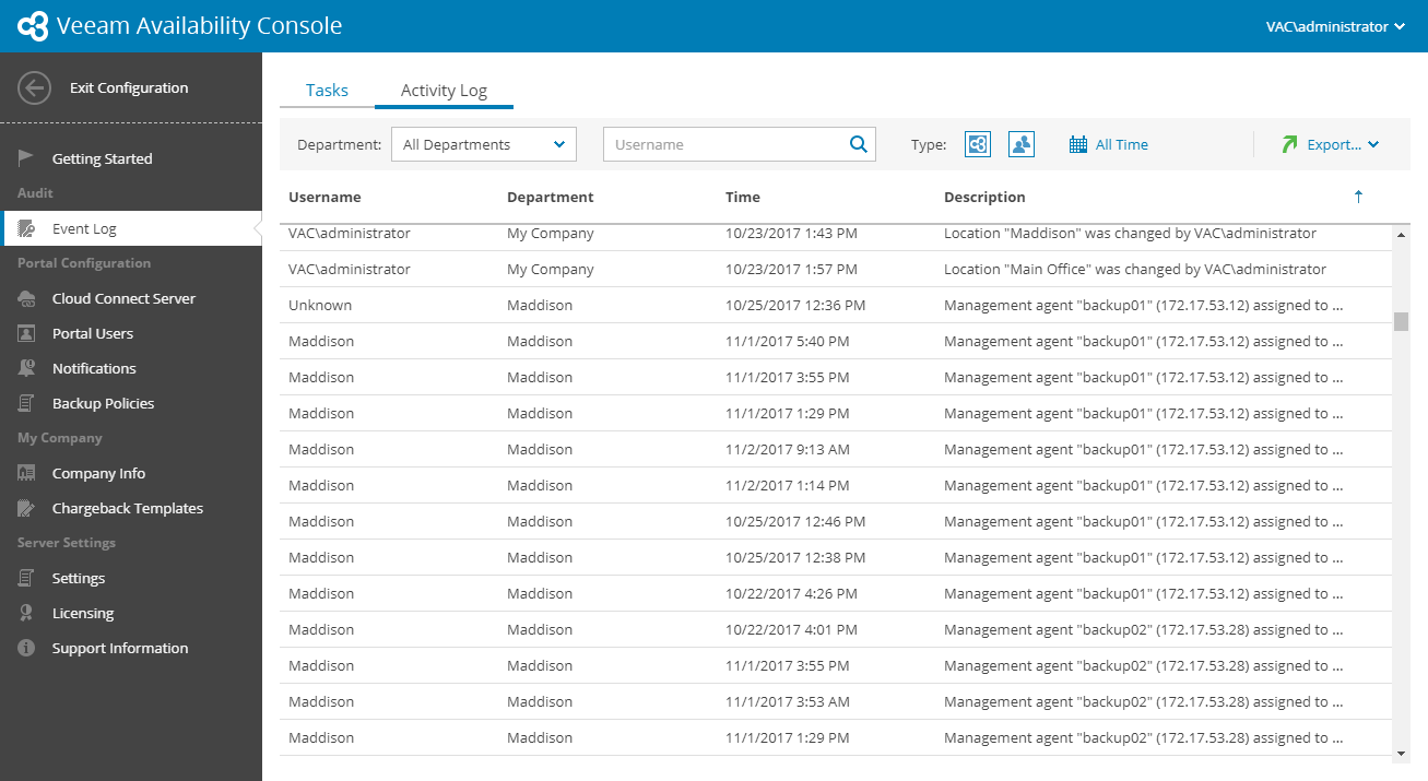 The activity log keeps track of configuration, management and security-related activities in Veeam Availability Console.