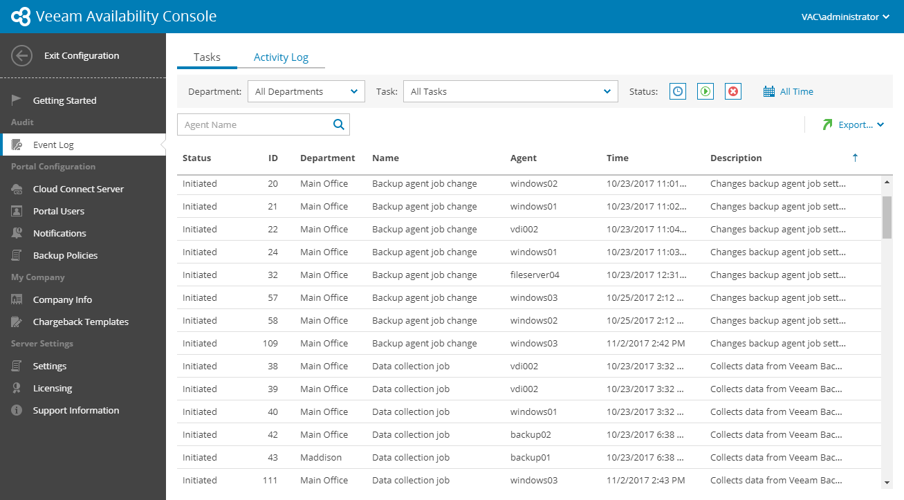 The task log keeps record of the most crucial operations that Veeam Availability Console management agents perform in the client managed infrastructure. Examples of tasks are deployment or uninstall of Veeam backup agents, start or stop of backup jobs, and so on.