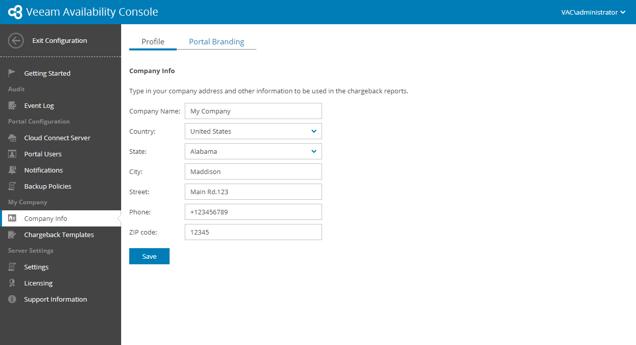 In the Company Info form, provide information about your company, that is, the company that provides managed backup services. This information makes up your company profile, and will be displayed in chargeback reports and email notifications.