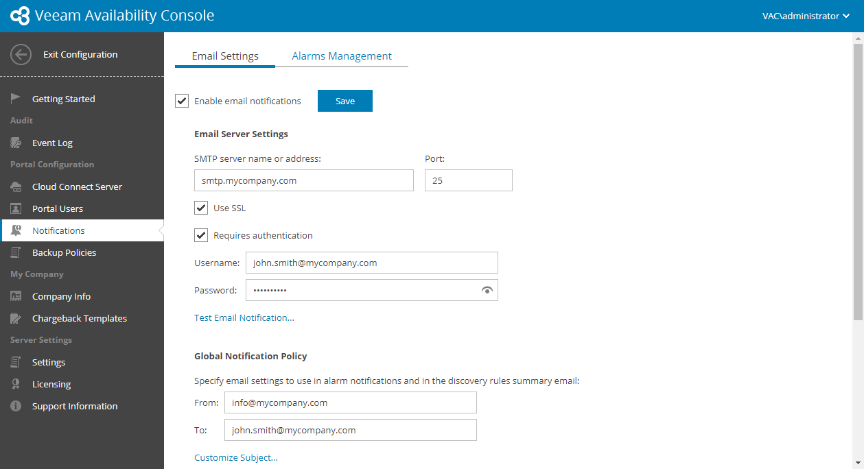 Specify email notification settings that Veeam Availability Console will use to send all types of email messages, including welcome email message, chargeback notifications, alarm notifications.