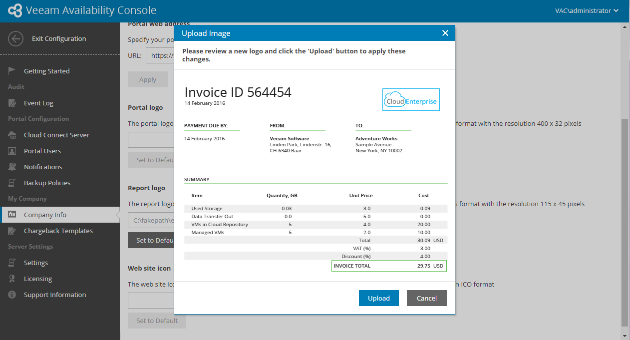 Customize appearance of the Veeam Availability Console portal, chargeback reports and e-mail notifications in accordance with your company branding.