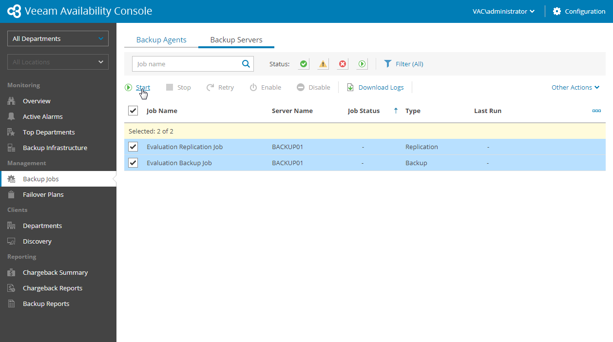 - Select a backup, replication or backup copy job in the list and click Start.