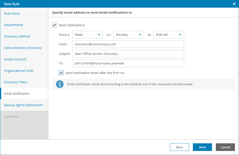 - At the Email Notification step of the wizard, you can enable notifications about discovery results by email.