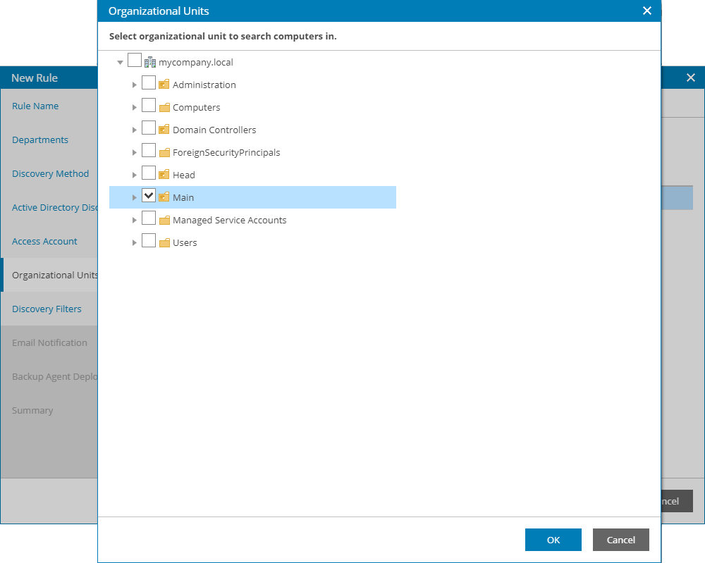 - In the Organizational Units window, select check boxes next to units that must be included to the discovery scope.
