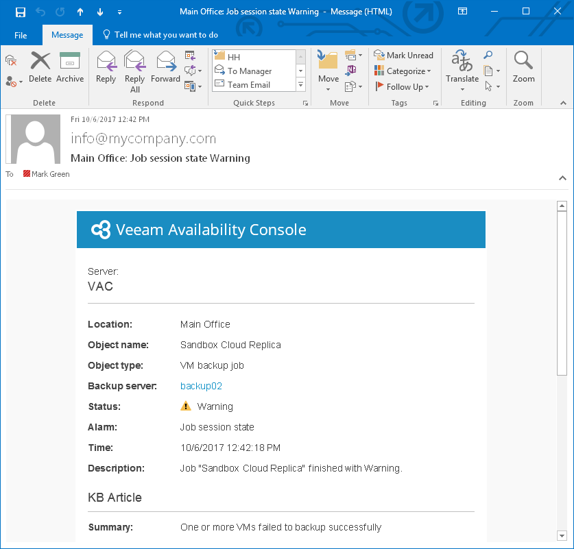 By default, Veeam Availability Console sends email notifications every time when a new alarm is triggered, or when the status of an existing alarm changes to Error or Warning. You can configure alarm response actions to send email notifications when an alarm acquires a specific status only. For example, you can choose to receive email notifications about errors and warnings only, and skip notifications about informational and resolved alarms.