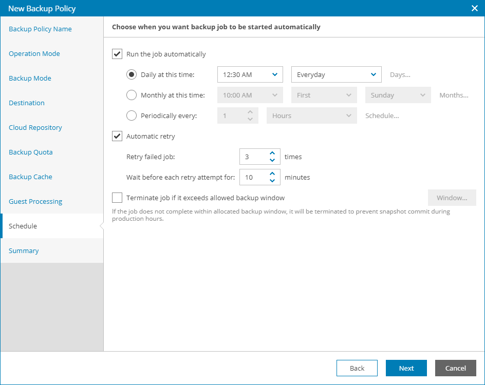 - Select the Terminate job if it exceeds allowed backup window check box and click Window.