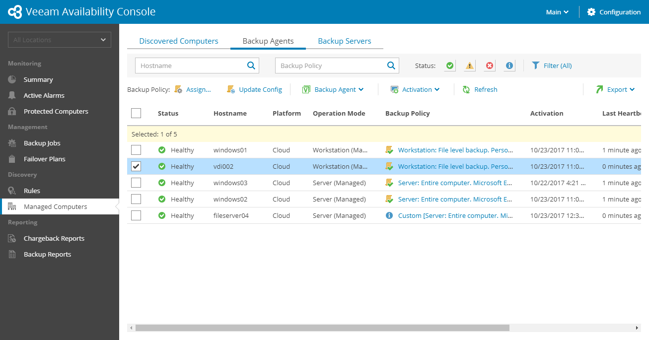 - Status — Veeam Availability Console management agent status (Healthy, Warning, Error, Unknown).