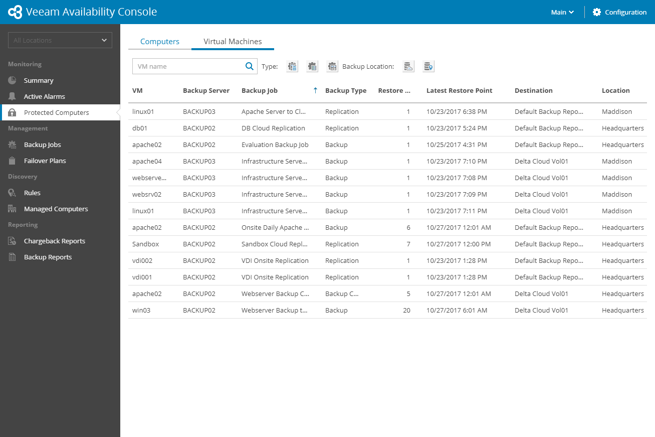 The Virtual Machines dashboard view shows the list of computers protected with Veeam Backup & Replication. A protected VMs is a VM that has at least one backup or replica restore point.