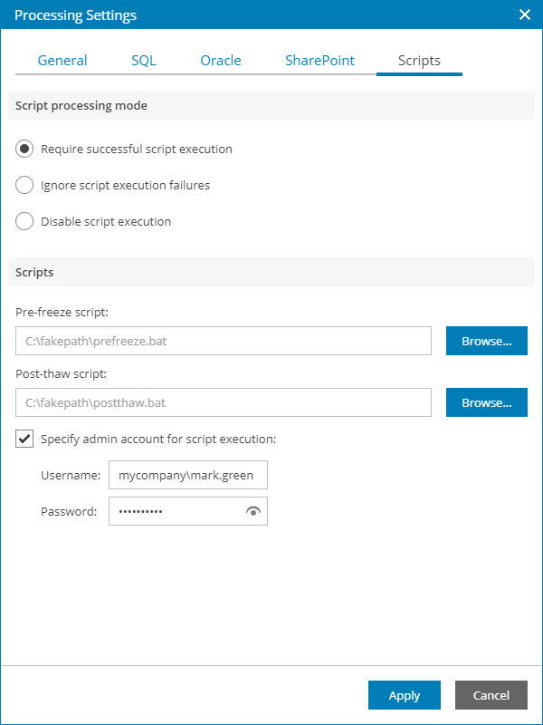 1. By default, Veeam backup agent performs guest processing activities under the Local System account. To specify a user account that Veeam backup agent must use to run pre-freeze and post-thaw scripts, select the Specify admin account for script execution check box and enter a user name and password for the user account.