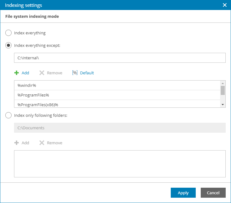 By default, system folders are excluded from indexing. You can add or delete folders using the Add and Remove buttons on the right. You can use system environment variables to form the list, for example: %windir%, %Program Files% and %Temp%.