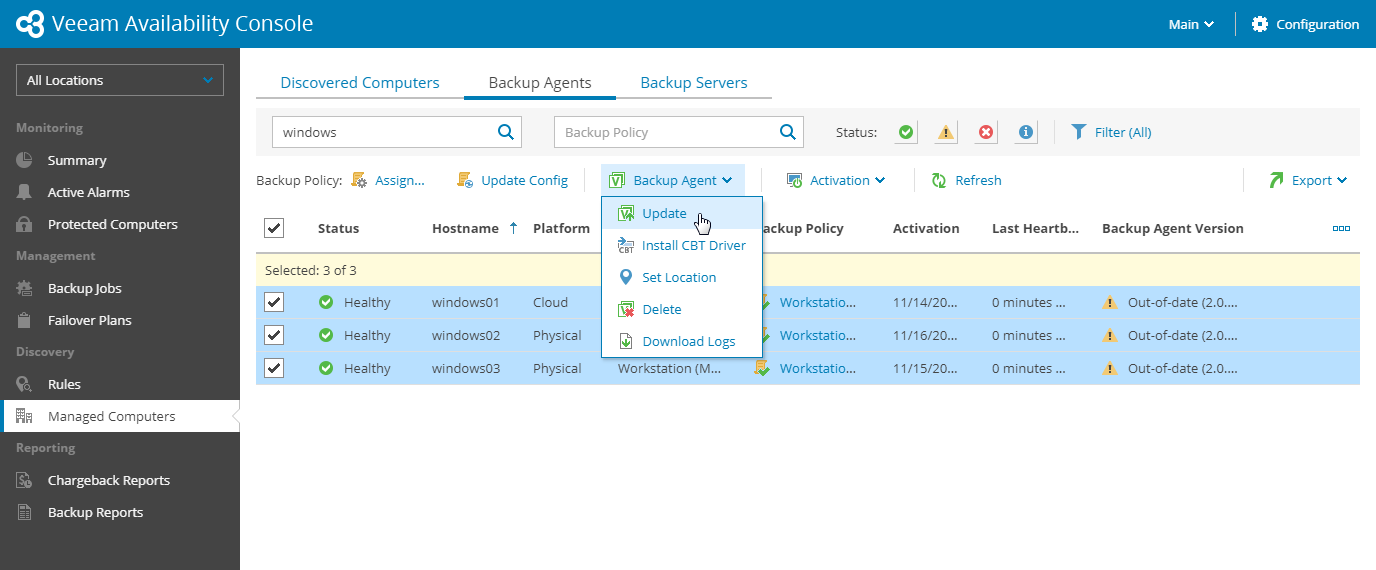 - If you installed Veeam backup agents with a discovery rule, you must update them as described in Updating Veeam Backup Agents Installed with Discovery Rules.