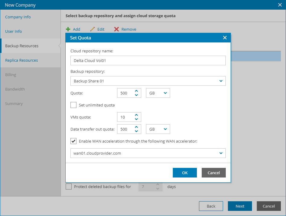 - In the VMs quota field, specify the maximum number of VMs that the company should store on the cloud repository.