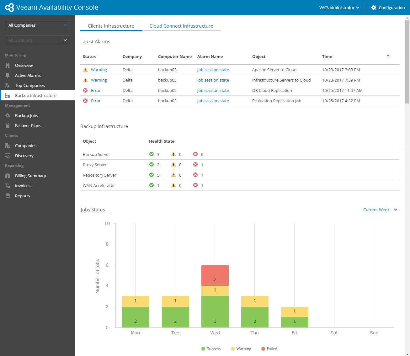 - To show data for a specific company and/or location, use company and location filters at the top left corner of the Veeam Availability Console window.