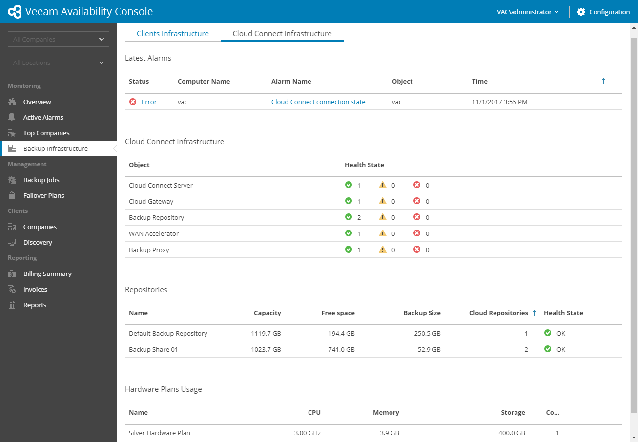 The Cloud Connect Infrastructure dashboard provides information about the Veeam Cloud Connect infrastructure health state, consumed and available repository resources, as well as hardware plan configuration details.