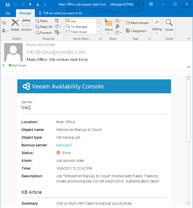 - Veeam Availability Console can send an email notification with alarm details when a new alarm is triggered or when the alarm status changes.
