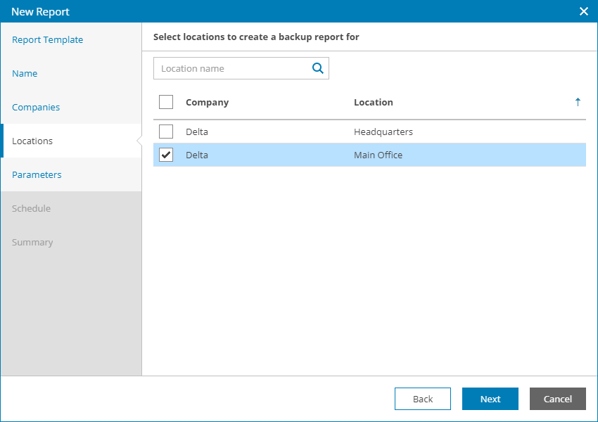 - At the Locations step of the wizard, select one or more company locations. Use the search field at the top to find the necessary location.