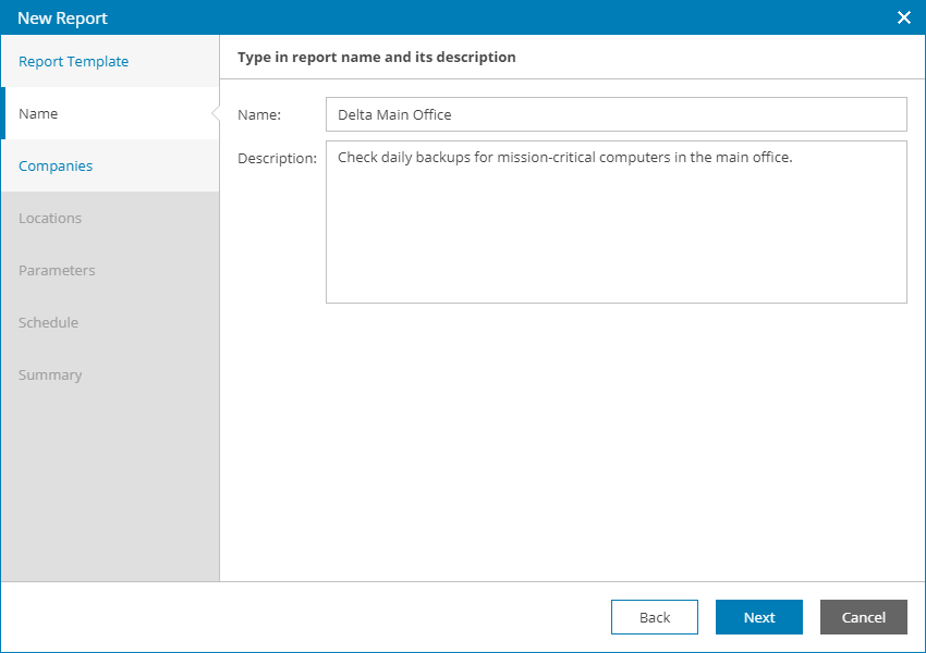 Before you run a backup report, you must create and save a report configuration. A report configuration stores custom report settings, such as the scope of the report, scheduling settings and so on. You can create multiple report configurations with different report settings for different companies and locations.