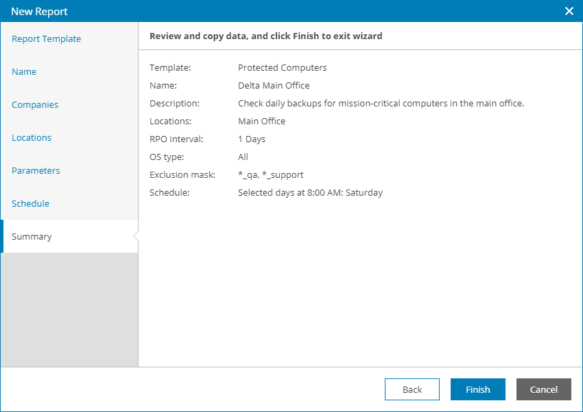 - At the Summary step of the wizard, review the report configuration and click Finish.