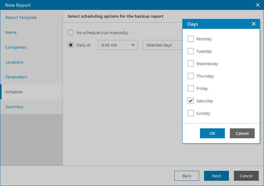 - At the Schedule step of the wizard, specify a schedule according to which the report must be generated and sent to companies: