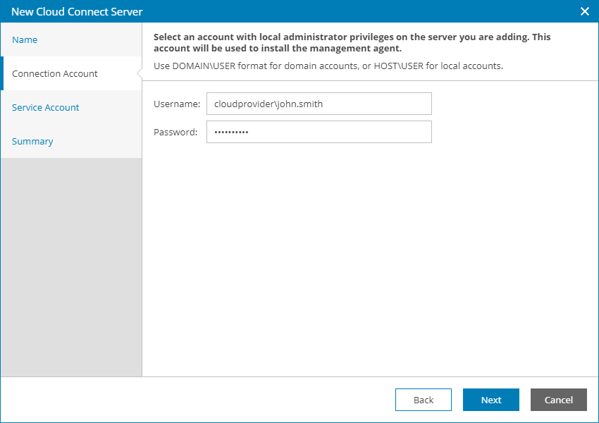 1. At the Connection Account step of the wizard, specify credentials of a user account with local Administrator privileges on the Veeam Cloud Connect server.
