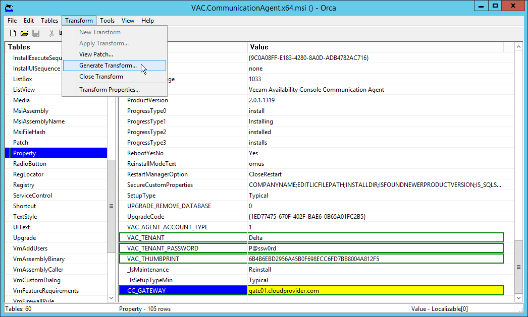You must create an MST file with custom configuration parameters and use this MST file to deploy the Veeam Availability Console management agents on client computers. The management agents will use parameters specified in the MST file to connect to a cloud gateway on the service provider side.