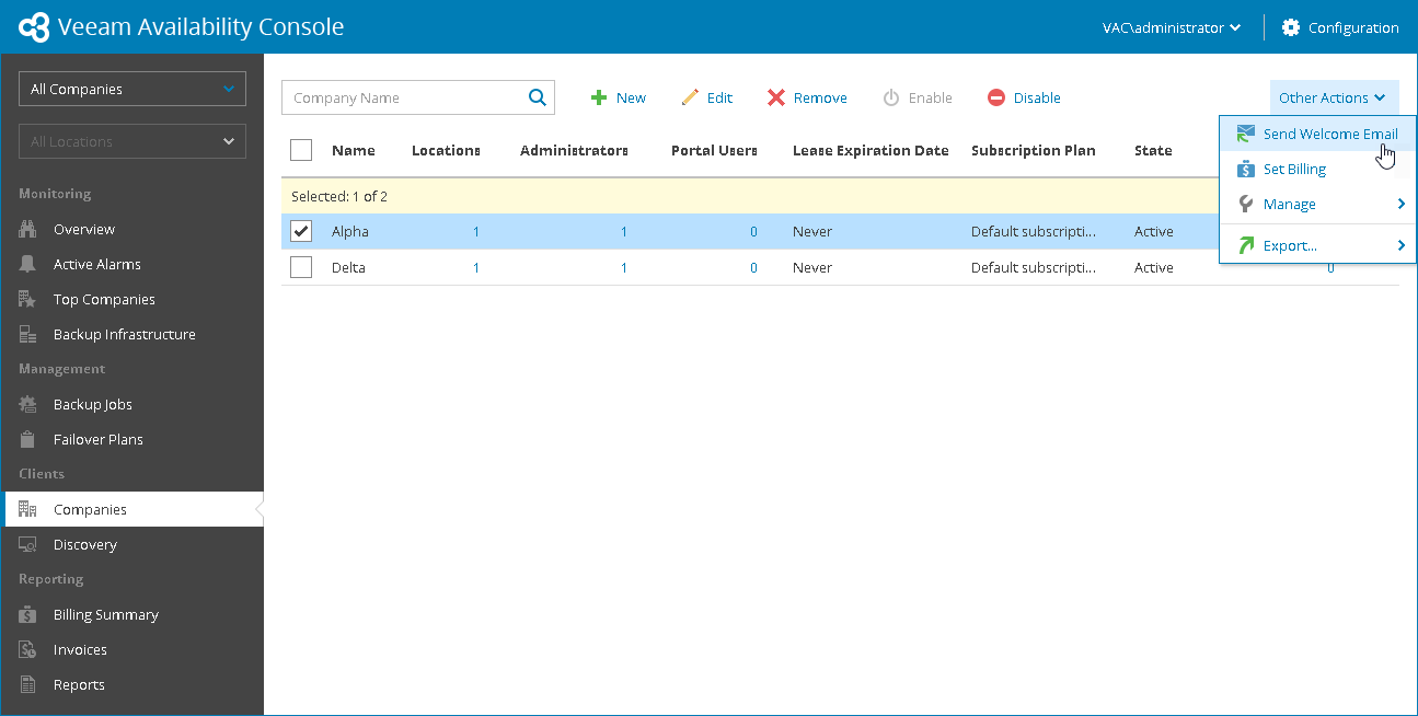 After you create a company account in Veeam Availability Console, you must provide to the company the user name and password of the Company Owner. To do this, you can either send a welcome email message, or share the credentials in any other convenient way. For more details on sending a welcome email message, see Sending Welcome Email Message.