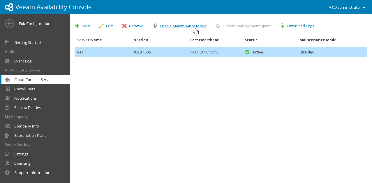 To put the Veeam Cloud Connect server to the maintenance mode, this server must run Veeam Backup & Replication 9.5 Update 3.
