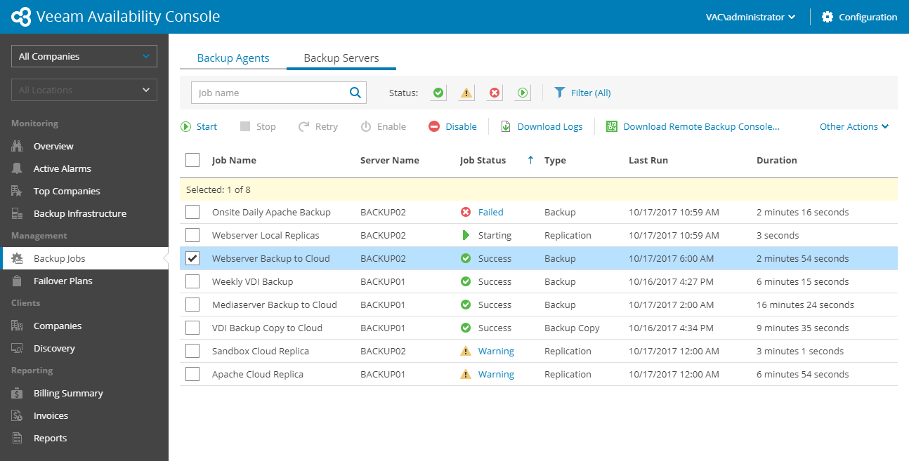 Veeam Availability Console will display a list of all Veeam Backup & Replication jobs configured on managed backup servers.