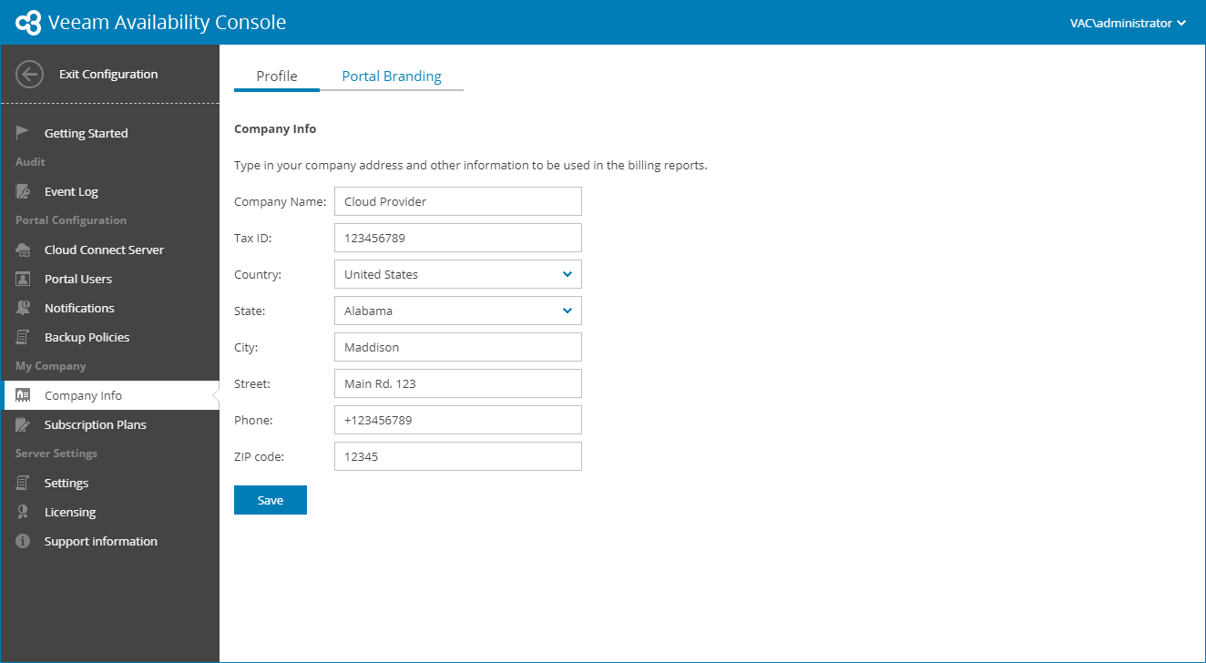 Before you start working with Veeam Availability Console, you must fill in the company profile. The profile contains information about the service provider company, such as the company name, address and so on. Company profile details are displayed in invoices, backup reports and email notifications.