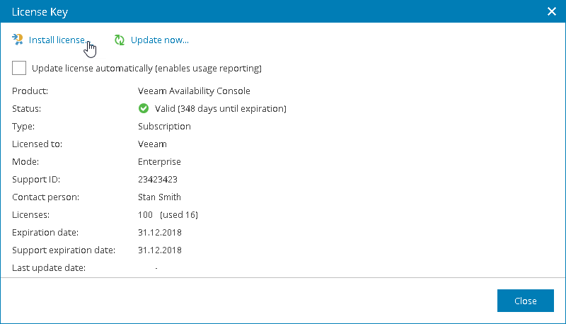After you choose the license file, Veeam Availability Console will display the Install license file window to show the result of the license installation.