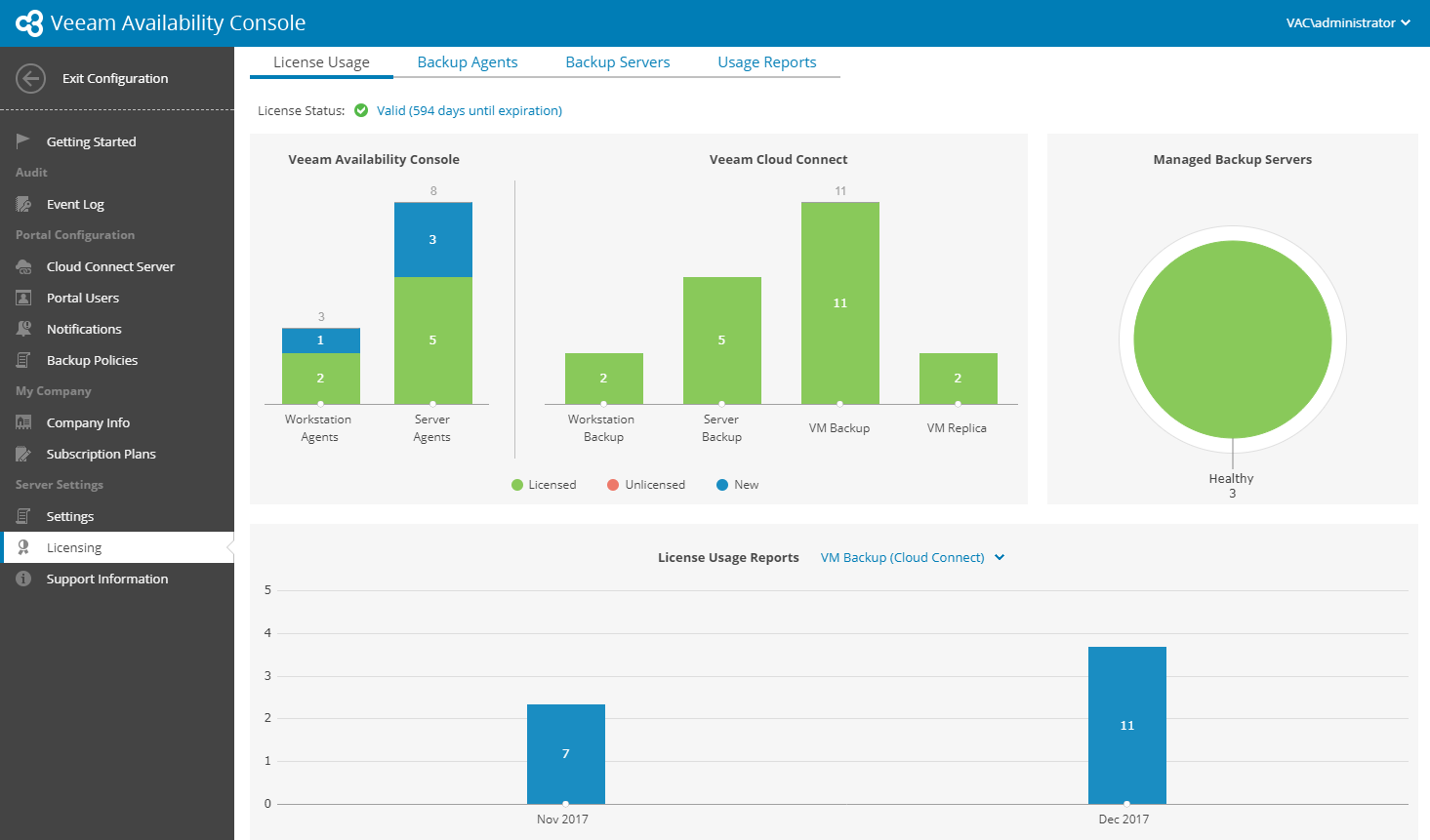 The License Usage view provides cumulative information about license usage for Veeam Availability Console, Veeam Cloud Connect and Veeam Backup & Replication.