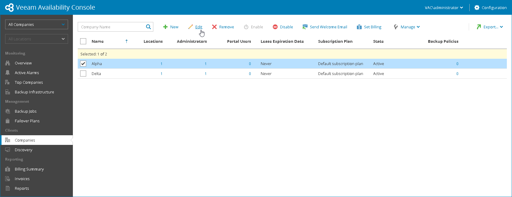 - Modify company account settings as described in Creating Companies in Veeam Availability Console.