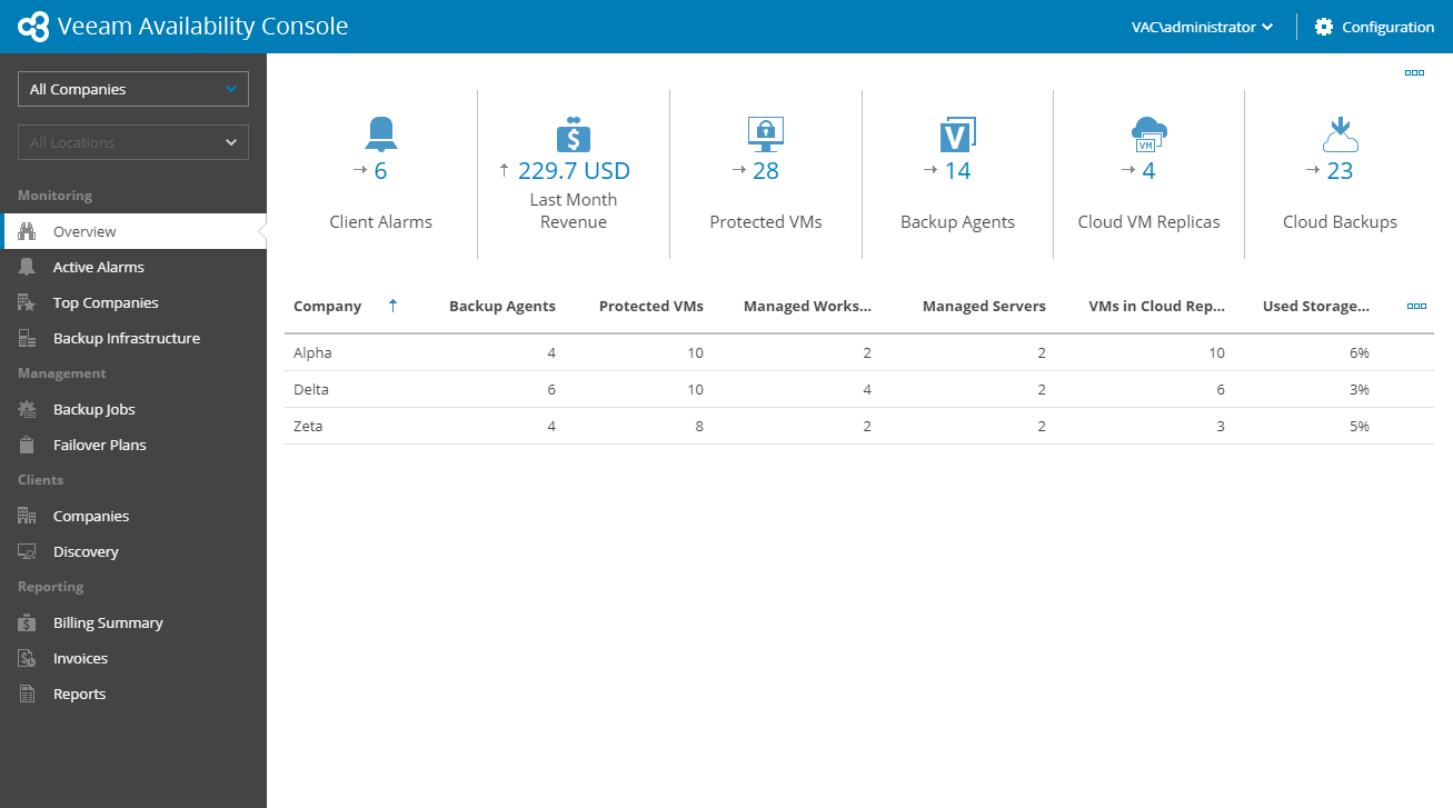 - To show data for a specific company and/or location, use company and location filters at the top left corner of the Veeam Availability Console window.