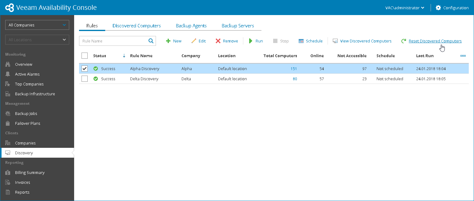 When you perform reset for a discovery rule, computers discovered with this rule are removed from the discovered computers list. However, computers on which Veeam Availability Console management agents are already installed remain in the list even after you perform reset.