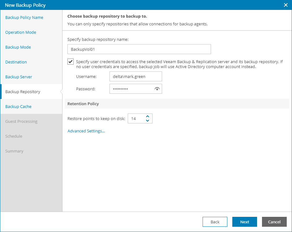Specify settings for the target backup repository: