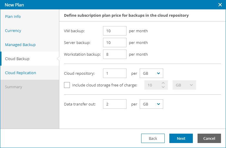 At the Cloud Backup step of the wizard, specify charge rates for storing backups in cloud repositories: