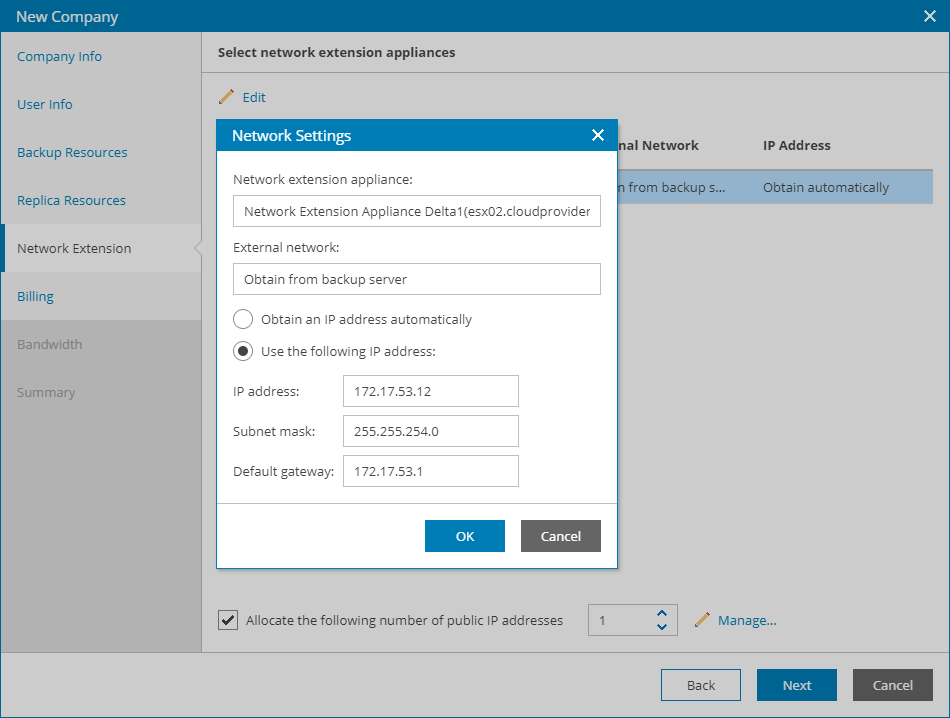 You can configure a network adapter (vNIC) on the network extension appliance. This network adapter connects the network extension appliance to the external network where the provider backup infrastructure components reside. For more details, see Network Extension Appliance.