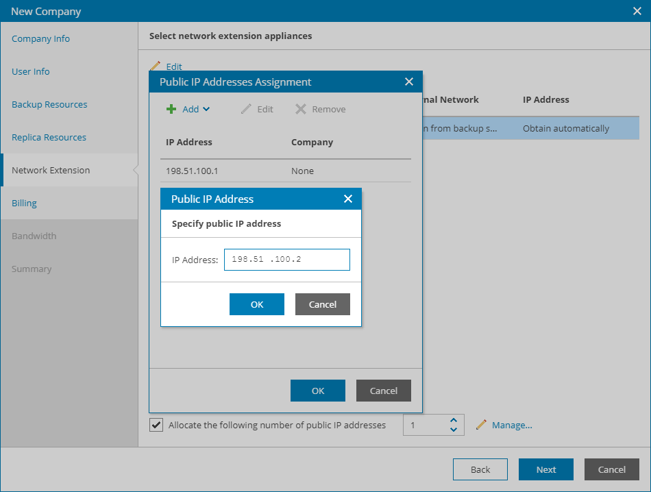 Veeam Backup & Replication will assign to the company the specified number of IP addresses from the reserved pool. A backup administrator on the company side can map a public IP address to a VM replica during cloud failover plan configuration. To learn more, see Specify Public IP Addressing Rules.
