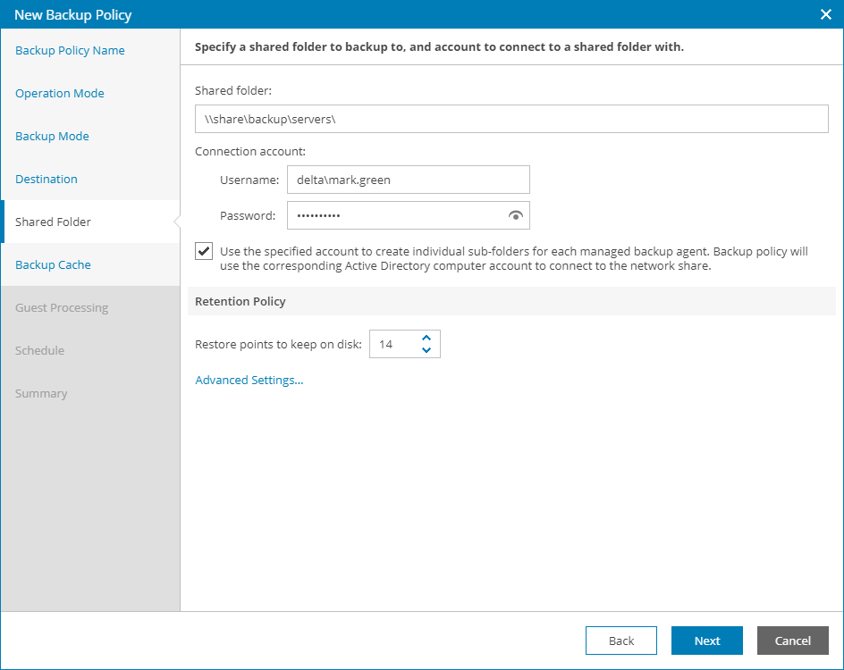 1. Select the Use the specified account to create individual sub-folders for each managed backup agent check box if backup of each managed computer must be stored in its own subfolder of the shared folder.