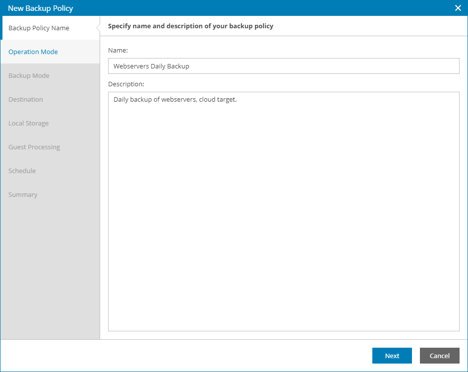 At the Backup Policy Name step of the wizard, specify name and description of the backup policy.